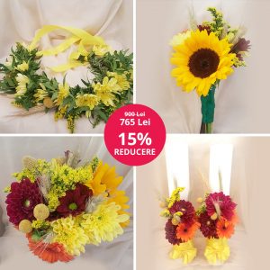 Flori : dahlie , floarea soarelui , solidago , spice de grau , craspedia , crizantema