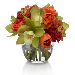 Buchetul contine floarea soarelui, trandafiri, hypericum, solidago, bete, heleborus, celosia, pittosporum, eringium, frunze de artar, salal