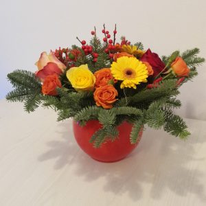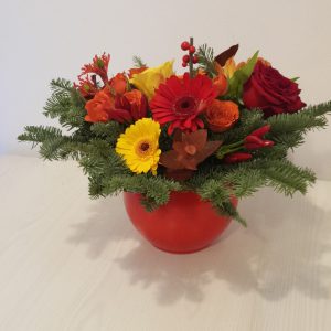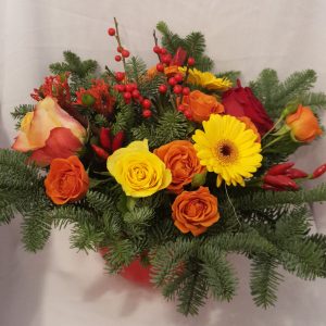 Aranjament Craciun Amarilis 9 contine :brad natural,amarilis,solidago,ilex,conuri.