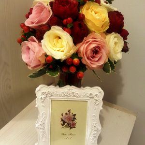 Buchet Mireasa BM 12 contine: trandafiri, hypericum,trandafiri redpiano, pittosporum.
