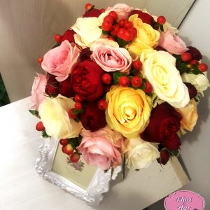 Buchetul Bucuria Toamnei contine: trandafiri,crizantema,gerbera,hypericum,pittosporum,mini rose,salal si ambalaj.