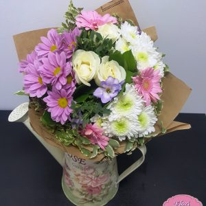 Buchet Garden Love contine: trandafiri, crizantema,gerbera, frezie, eucalipt,pittosporum, salal si ambalaj.