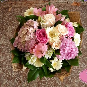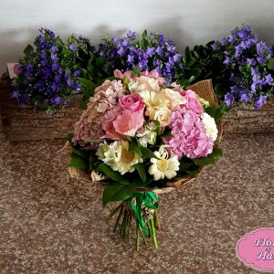 Buchet Hortensie contine: trandafiri, bujori, hortensie, frezie, eucalipt, anthirinium, garoafe, salal si ambalaj.