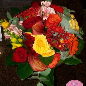Buchet Curcubeu contine: cale,coral,crizantema,dalie,eucalipt,frezie,gerbera,salal,trandafiri si ambalaj.
