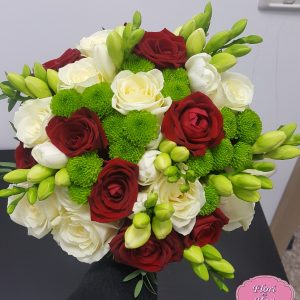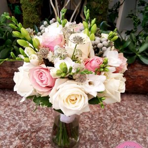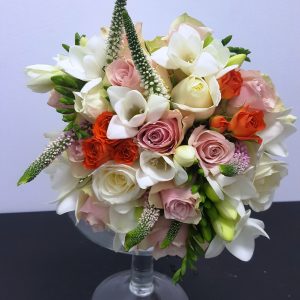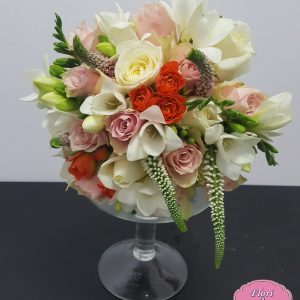 Buchet Cocktail contine: zambile, alstromeria, lisianthus, mini rosa, frezie, trandafiri, salal, eucalipt.
