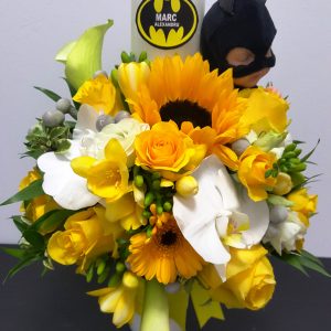 Lumanare botez Batman(40cm) contine: floarea soarelui, orhidee phalaenopsis, frezie, trandafiri, cala, brumia, gerbera, ruscus, inaltime 40 cm.