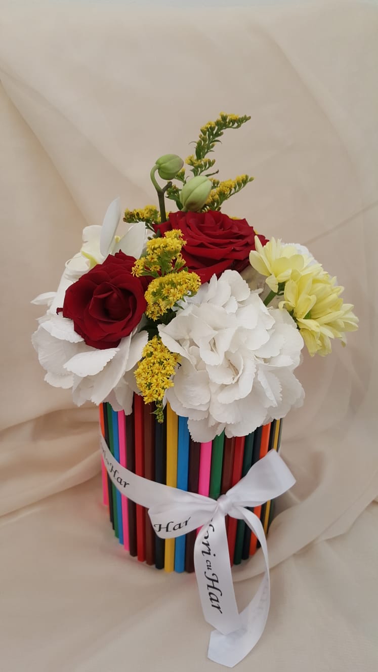 Aranjamentul contine cutie imbracata in creioane colorate , hortensie , trandafiri , orhidee phalaenopsis , solidago si crizantema .