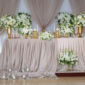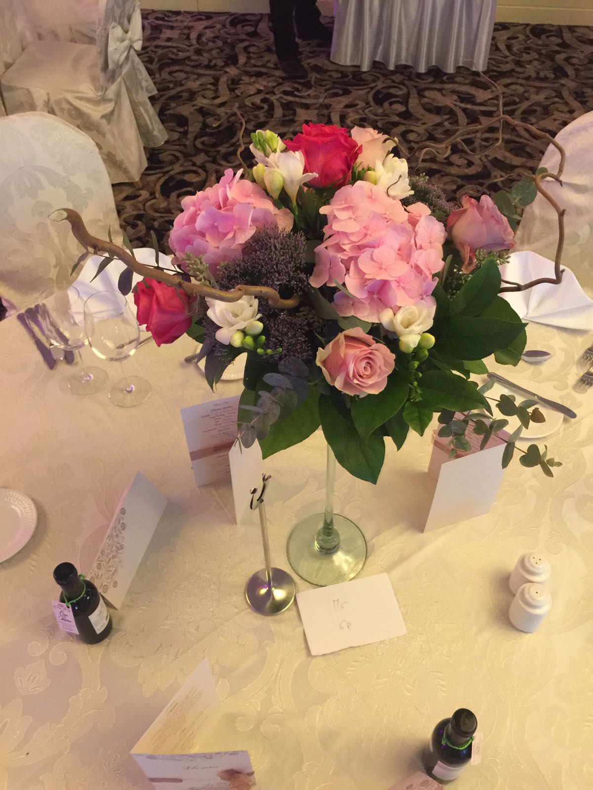 Aranjamnetul de masa contine : trahelium , trandafiri , hortensie , frezii albe , eucalipt , salal .