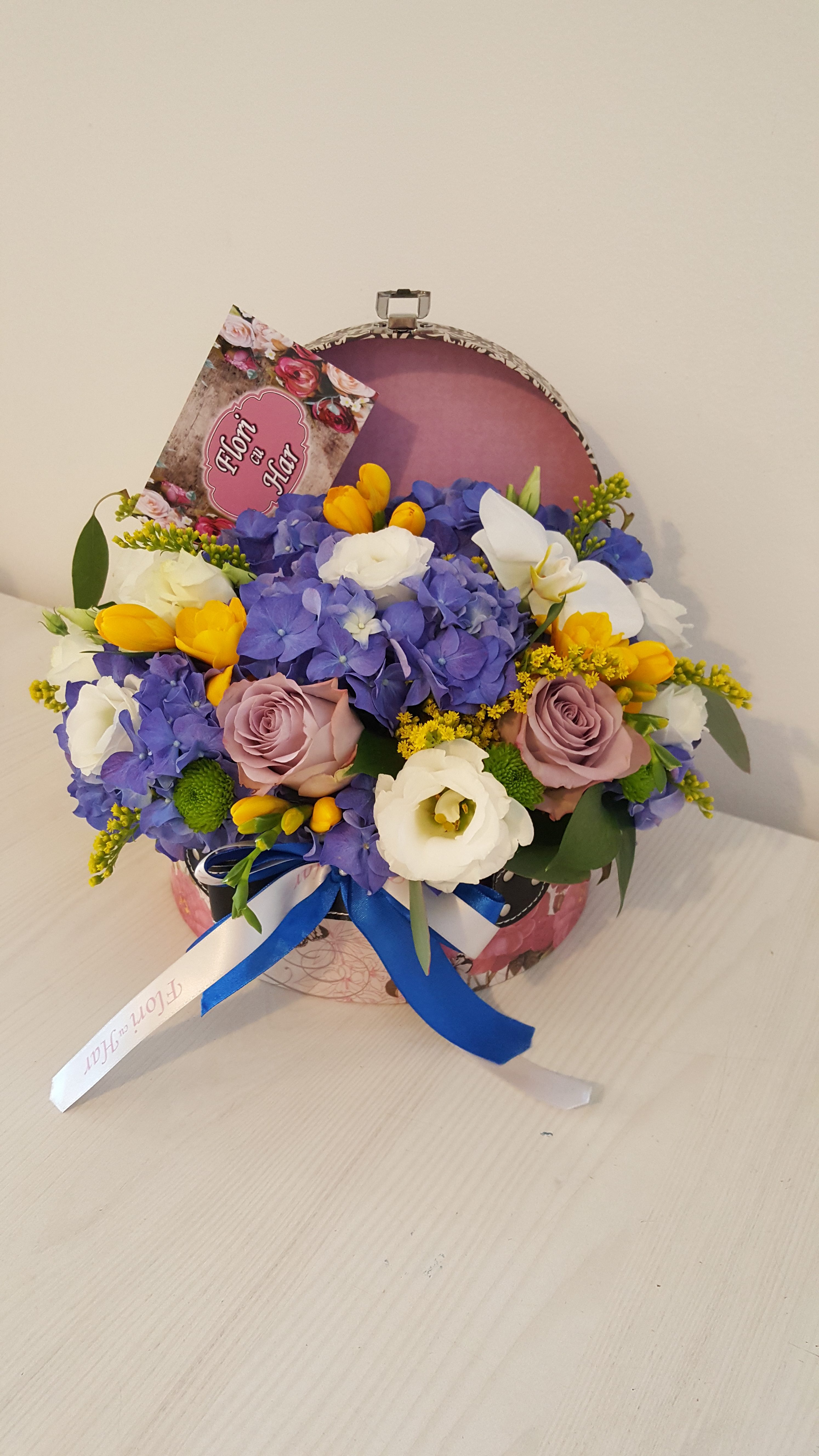 Aranjamentul contine cutie , hortensie albastra , lisianthus alb , trandafiri memory lane , frezii galbene , solidago , eucalipt , santini verde , phalaenopsisi alb , funda .