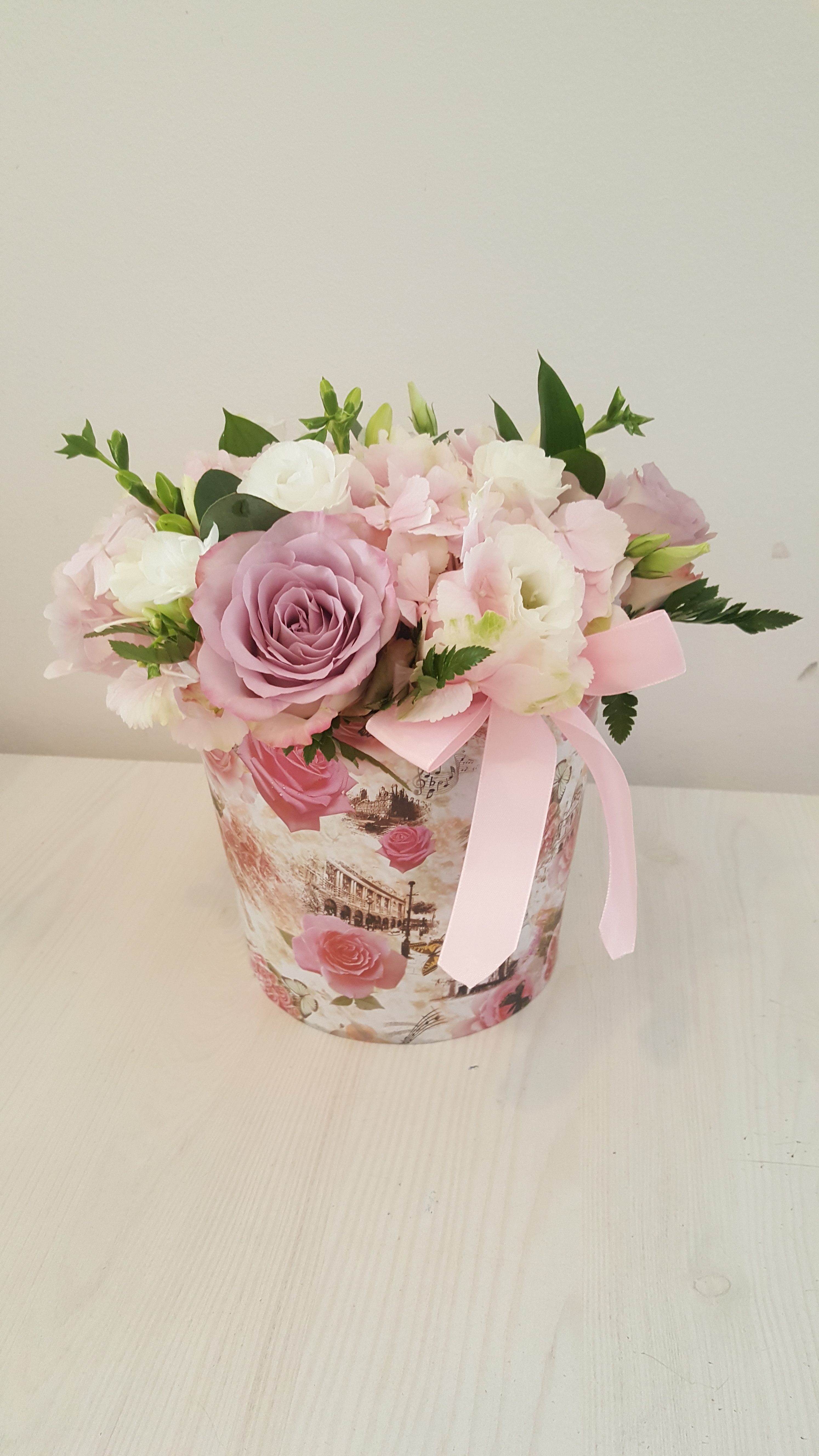 Aranjamentul contine cutie , tradafiri memory lane , frezii albe , lisianthus alb si roz , ruscus , feriga , hortensie , funda .