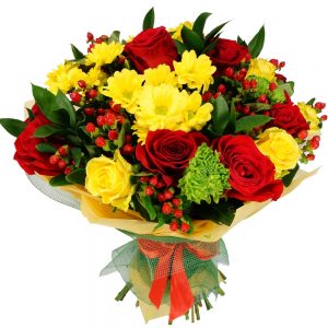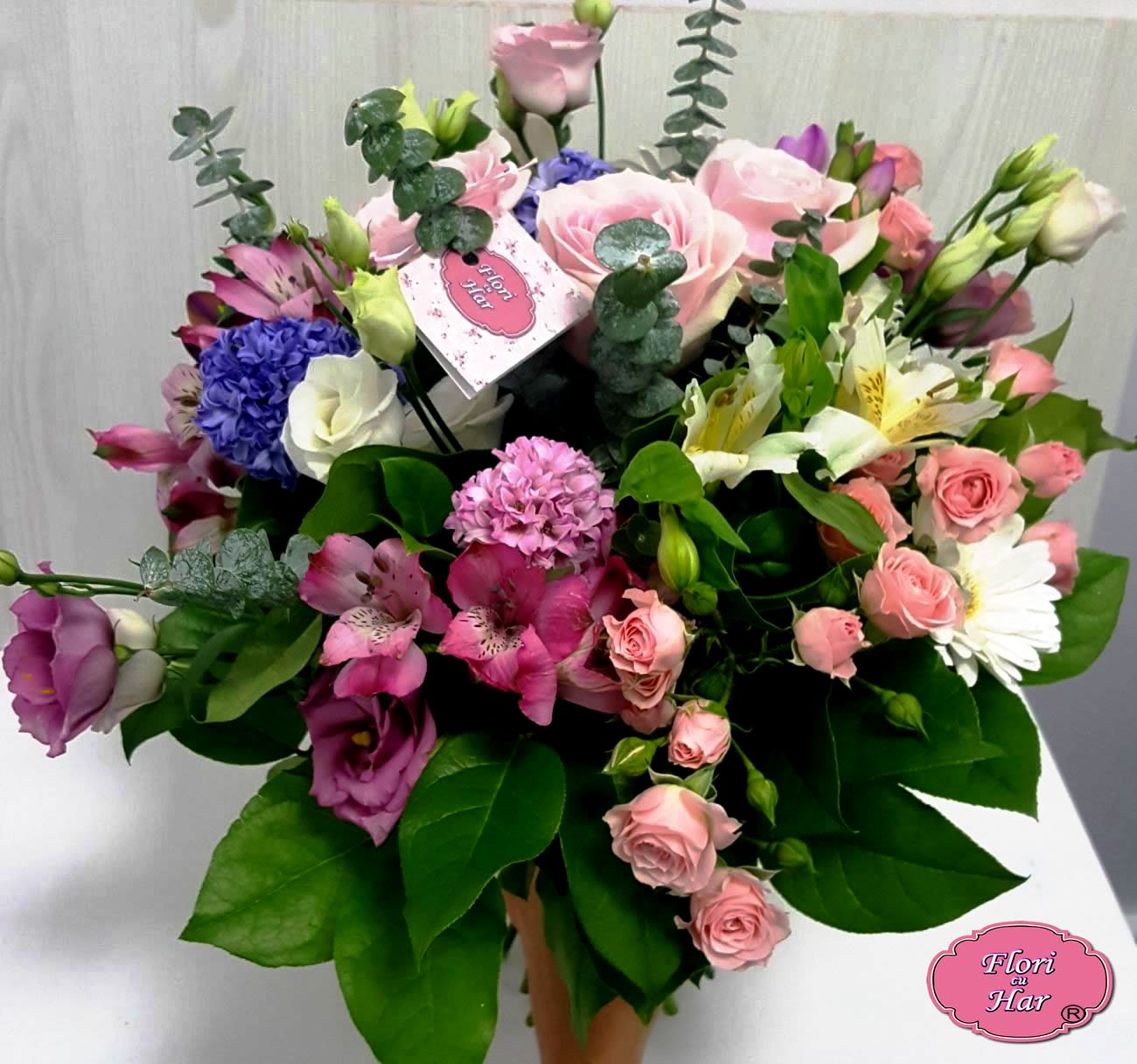 Buchet Cocktail contine: zambile, alstromeria, lisianthus, mini rosa, frezie, trandafiri, salal, eucalipt.