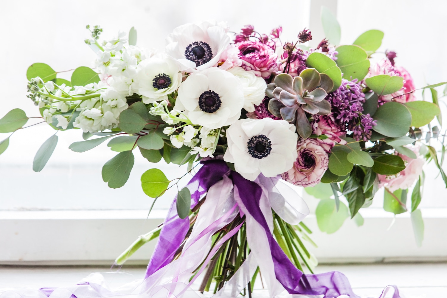 Buchetul contine mathiola, anemone, ranunculus, suculente, astrantia, liliac, eucalipt