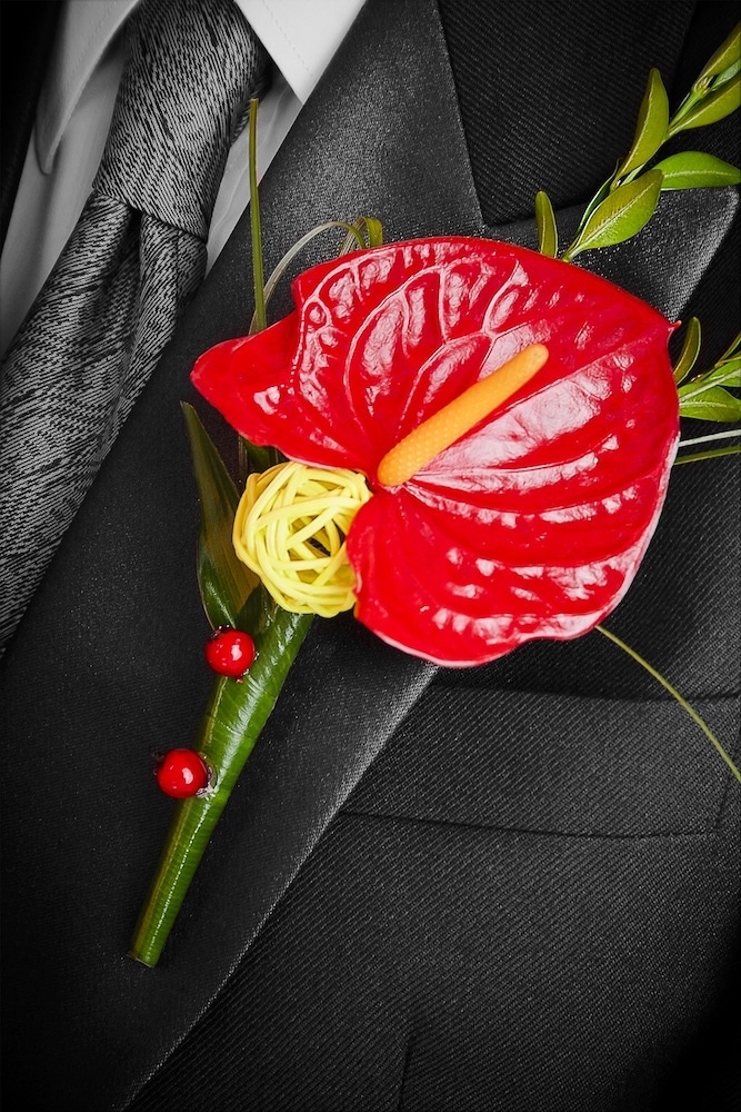 Cocarda cuprinde 1 anthurium, verdeata si alte materiale