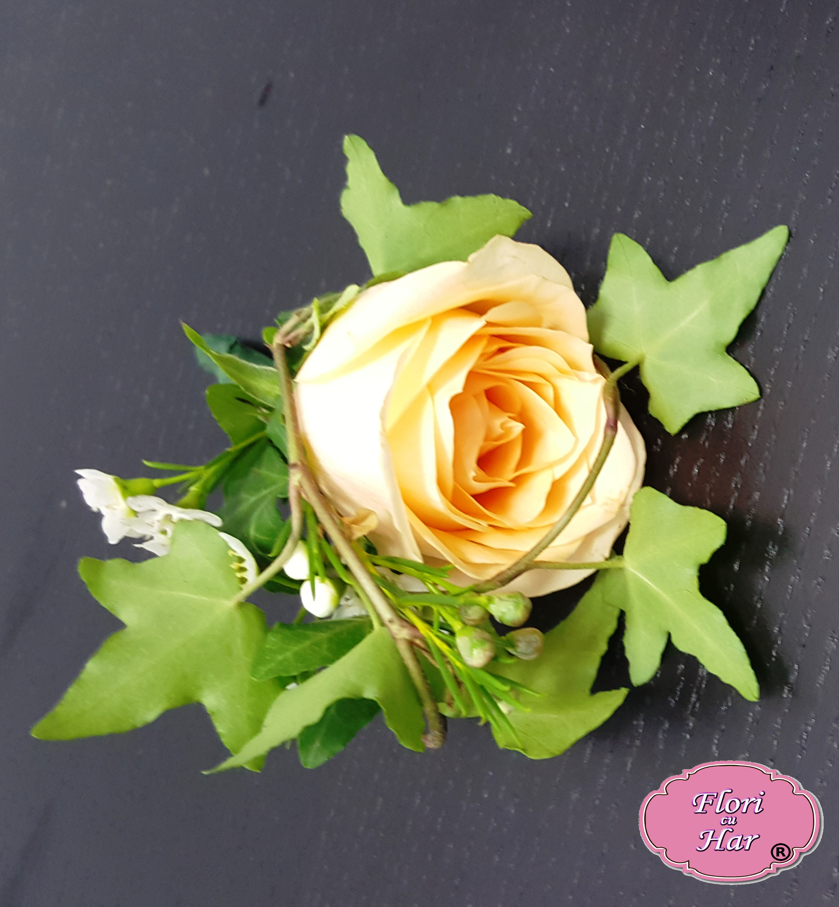 Cocarda C14 contine: trandafir, hedera, wax flowers.