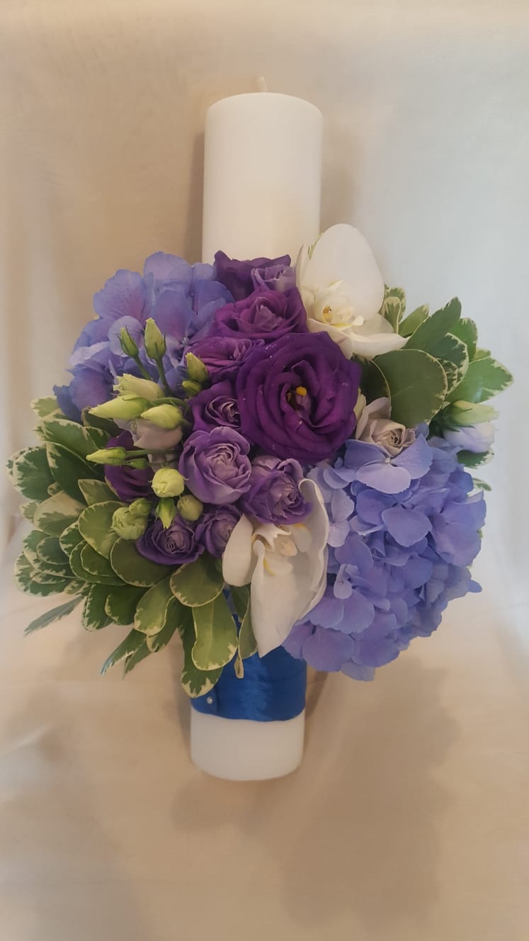 Lumanare de 40 cm , decorata cu lisianthus , hortensie , orhidee phalaenopsis si pittosporum.
