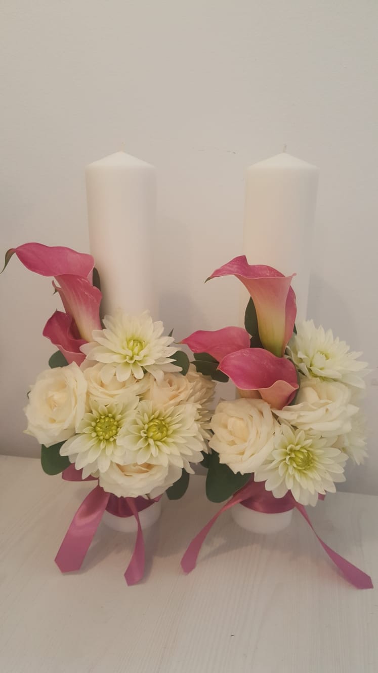 Lumanare scurta de 40 cm decorata cu cale , dahlie , trandafiri .