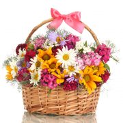 Aranjamentul contine trandafiri, iris, crizantema, crin asiatic, verdeata, cos